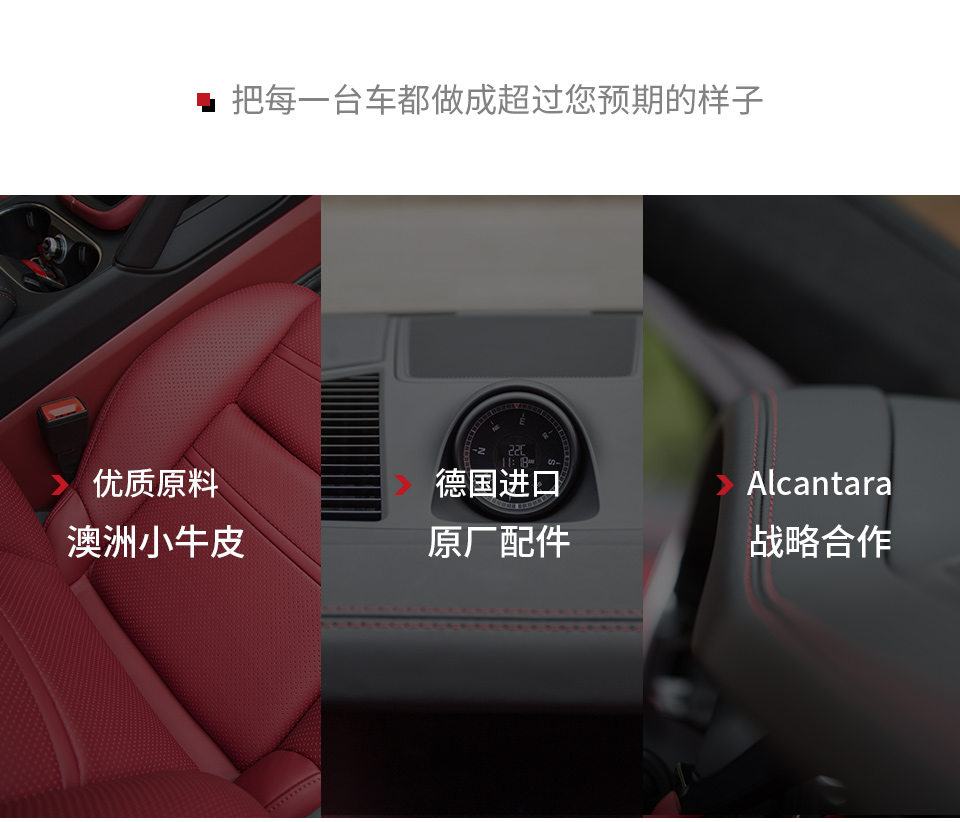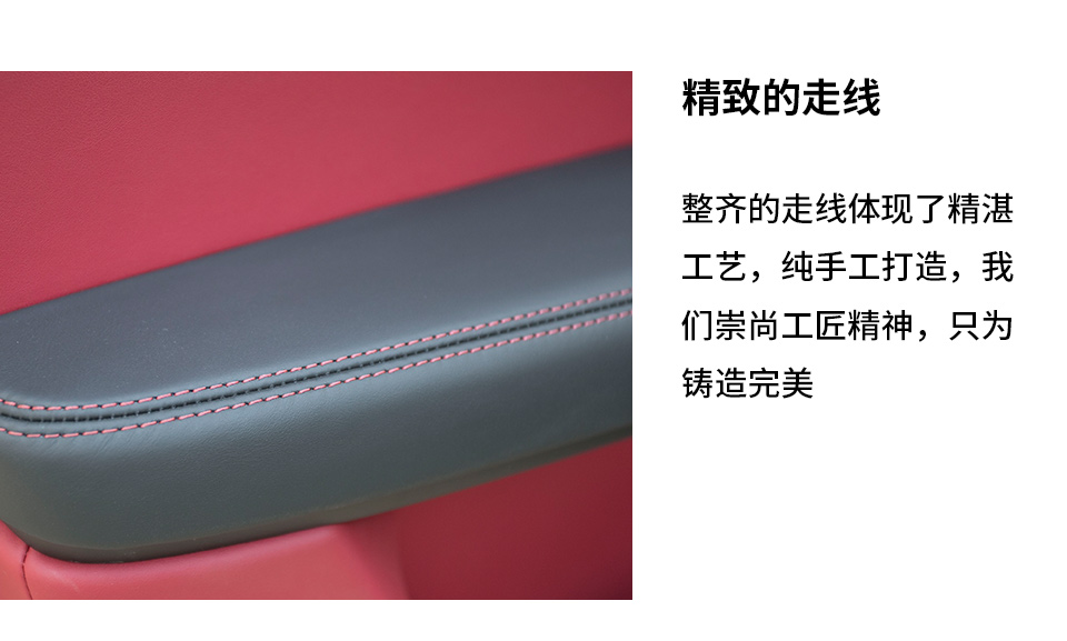 特 點: 全車進口小牛皮真皮紅黑內(nèi)飾真皮豪華質(zhì)感,可根據(jù)個性需求定制顏色方案!