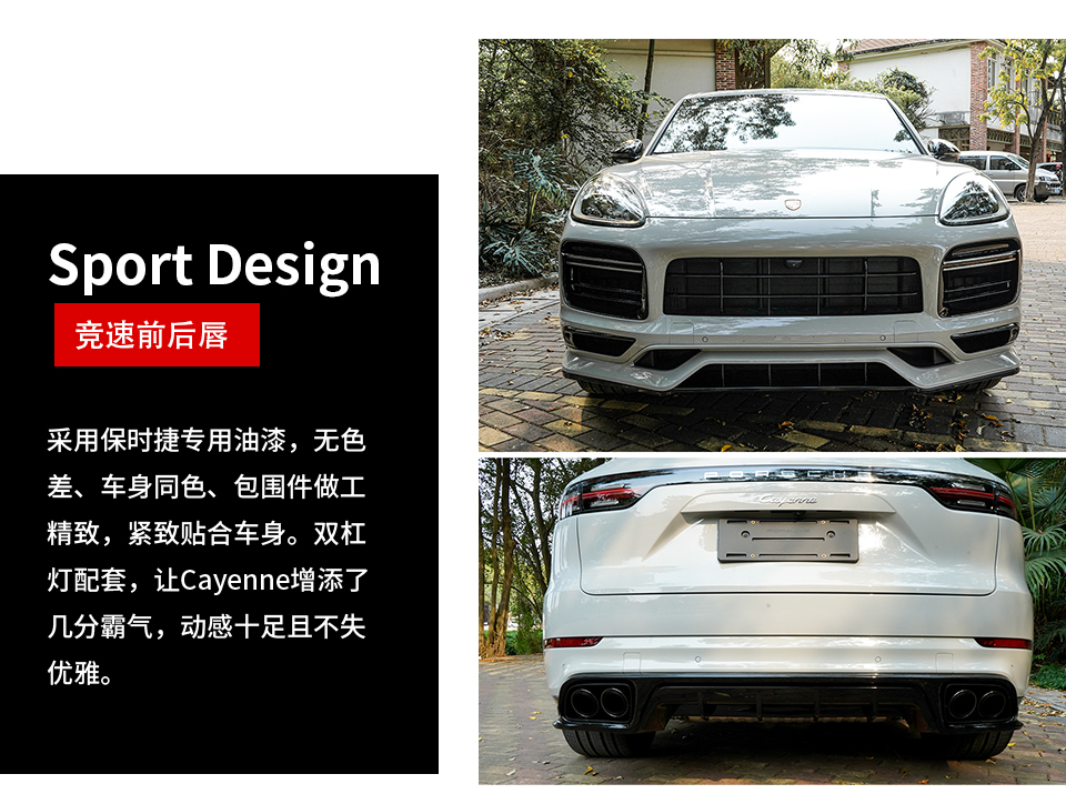 特 點: 卡宴Sport Design包圍,從視覺上告別了原車的黑色塑料感,與車身同色設(shè)計,提升了側(cè)面外觀的視覺感,同時360°無死角包圍后裙,使得整部卡宴愛車整體外觀更為協(xié)調(diào),融合度更高,運動感十足!
