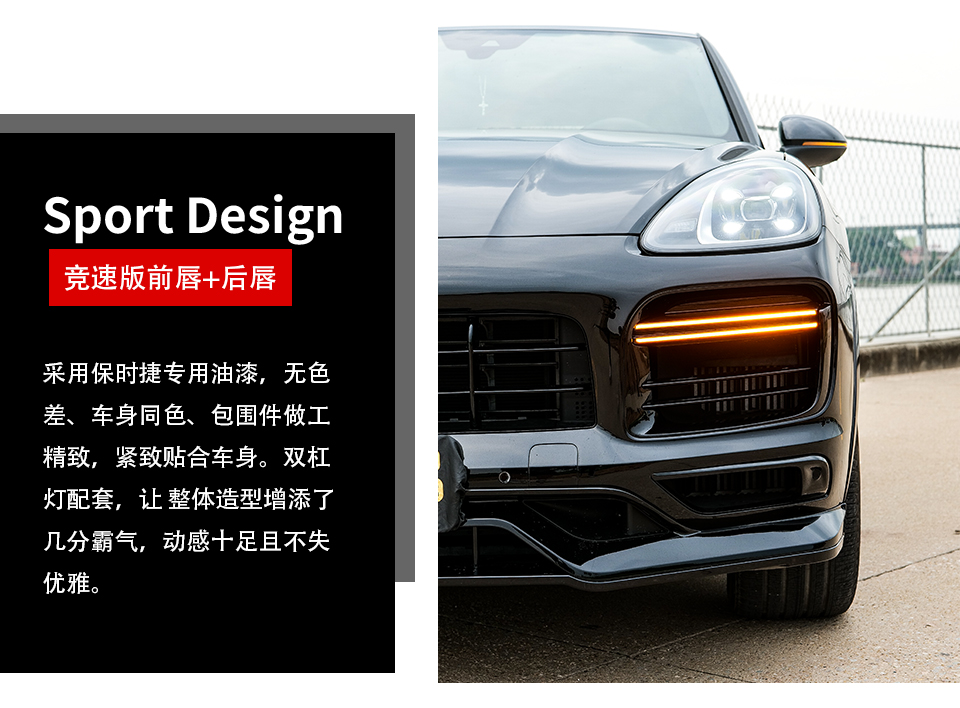 特 點(diǎn): 卡宴Sport Design包圍競(jìng)速版前后唇,從視覺(jué)上告別了原車的黑色塑料感,與車身同色設(shè)計(jì),提升了側(cè)面外觀的視覺(jué)感,使得整部卡宴愛(ài)車整體外觀更為協(xié)調(diào),融合度更高,運(yùn)動(dòng)感十足!