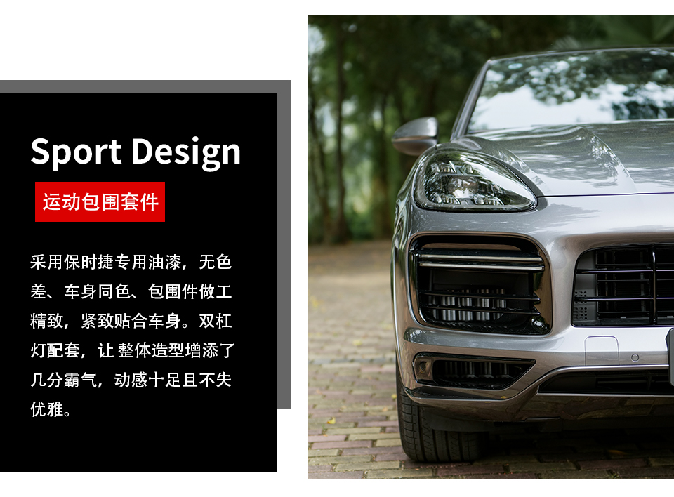 特 點: 卡宴Sport Design包圍+ 儀表紙 +卡鉗噴漆,從視覺上告別了原車的黑色塑料感,與車身同色設計,提升了側(cè)面外觀的視覺感,使得整部卡宴愛車整體外觀更為協(xié)調(diào),融合度更高,運動感十足!