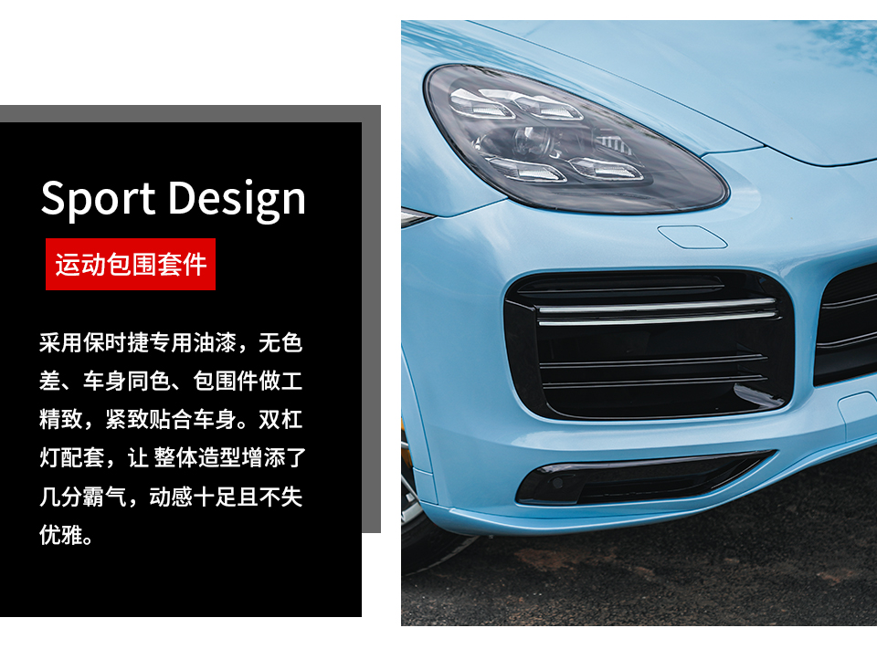 特 點(diǎn): 卡宴Sport Design包圍+LED矩陣大燈+尾燈,從視覺上告別了原車的黑色塑料感,與車身同色設(shè)計(jì),提升了側(cè)面外觀的視覺感,使得整部卡宴愛車整體外觀更為協(xié)調(diào),融合度更高,運(yùn)動(dòng)感十足??!