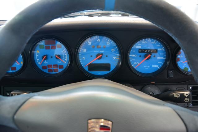 進(jìn)入車內(nèi),呼吸著皮質(zhì)老化的芳香,五個(gè)老式的機(jī)械儀表盤(pán)同時(shí)會(huì)緊緊吸住你的目光,而儀表盤(pán)底色與車漆顏色相同,更是突顯個(gè)性的一面。三輻方向盤(pán)造型經(jīng)典又不失時(shí)尚,而翻毛皮材質(zhì)包裹使其握感極其出色,且浮雕工藝的保時(shí)捷徽標(biāo)在當(dāng)時(shí)更是引領(lǐng)潮流。